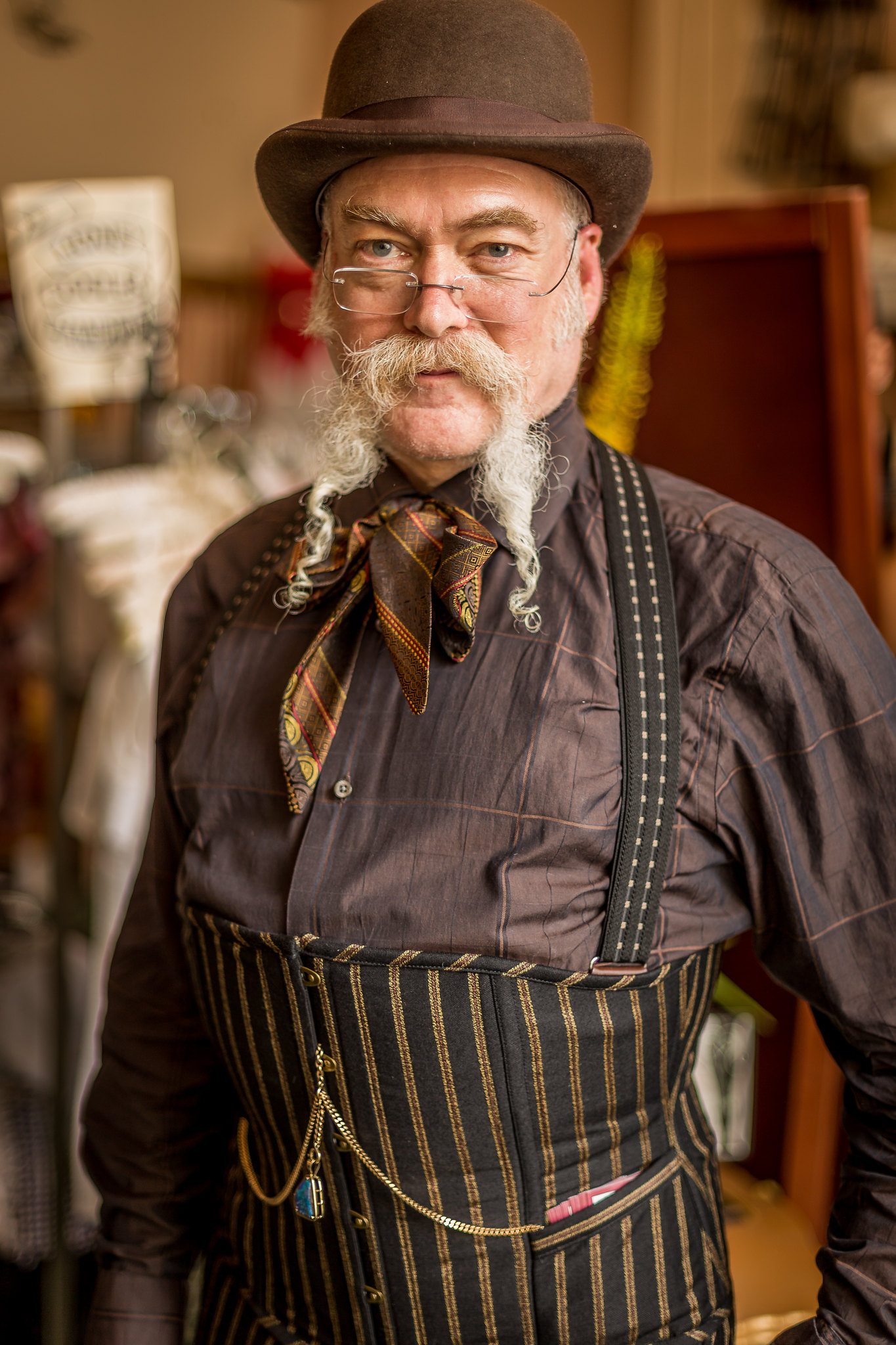 We can add pockets to any of our corsets. Our pockets are big enough to hold lipstick, business cards, or a pocket watch, but we don't recommend relying on them to hold cellphones. By default, the pockets will be made from the same fabric as your corset. If you're looking for a more unique design featuring multiple fabrics, we'll work with you to find the perfect contrast. Brocade, striped, and plaid fabrics will have pattern-matched pockets.