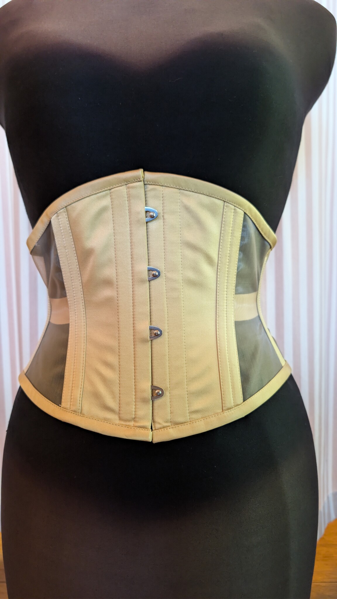 This Waspie comes in honey satin with fawn mesh panels — a rare ready-to-ship Risqué Waspie! Size 24, suitable for a natural waist of around 28". Please contact us for a photo.