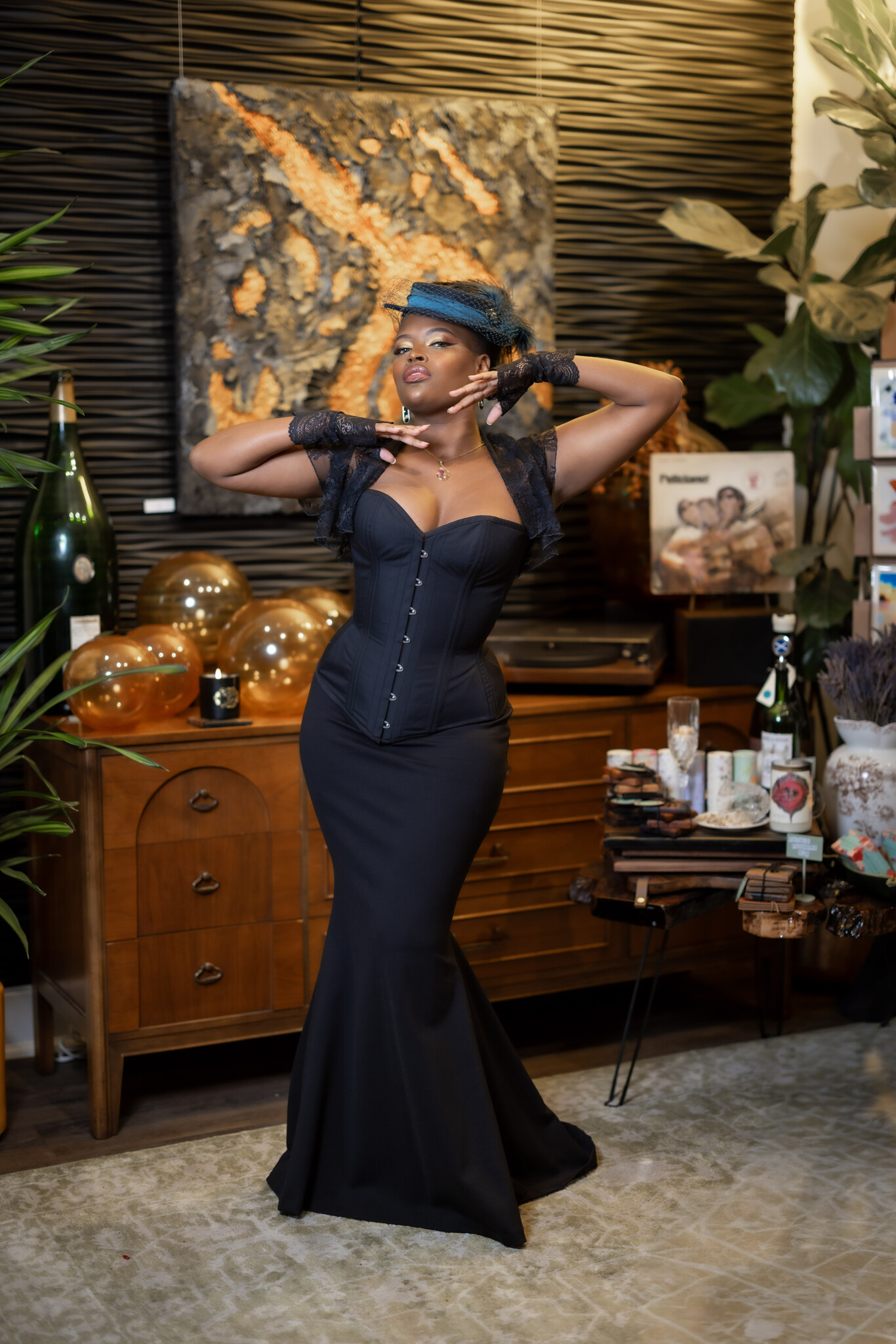 This classic black evening skirt is associate designer Marianne Faulkner’s take on the elegant lines of Sargent’s infamous painting of a Parisian socialite. Contoured to the hips and rear, the skirt flows into a graceful mermaid flare with a small train. Black ponte fabrication makes for easy care and can be paired with our black poplin corsets for an instant formal ensemble.