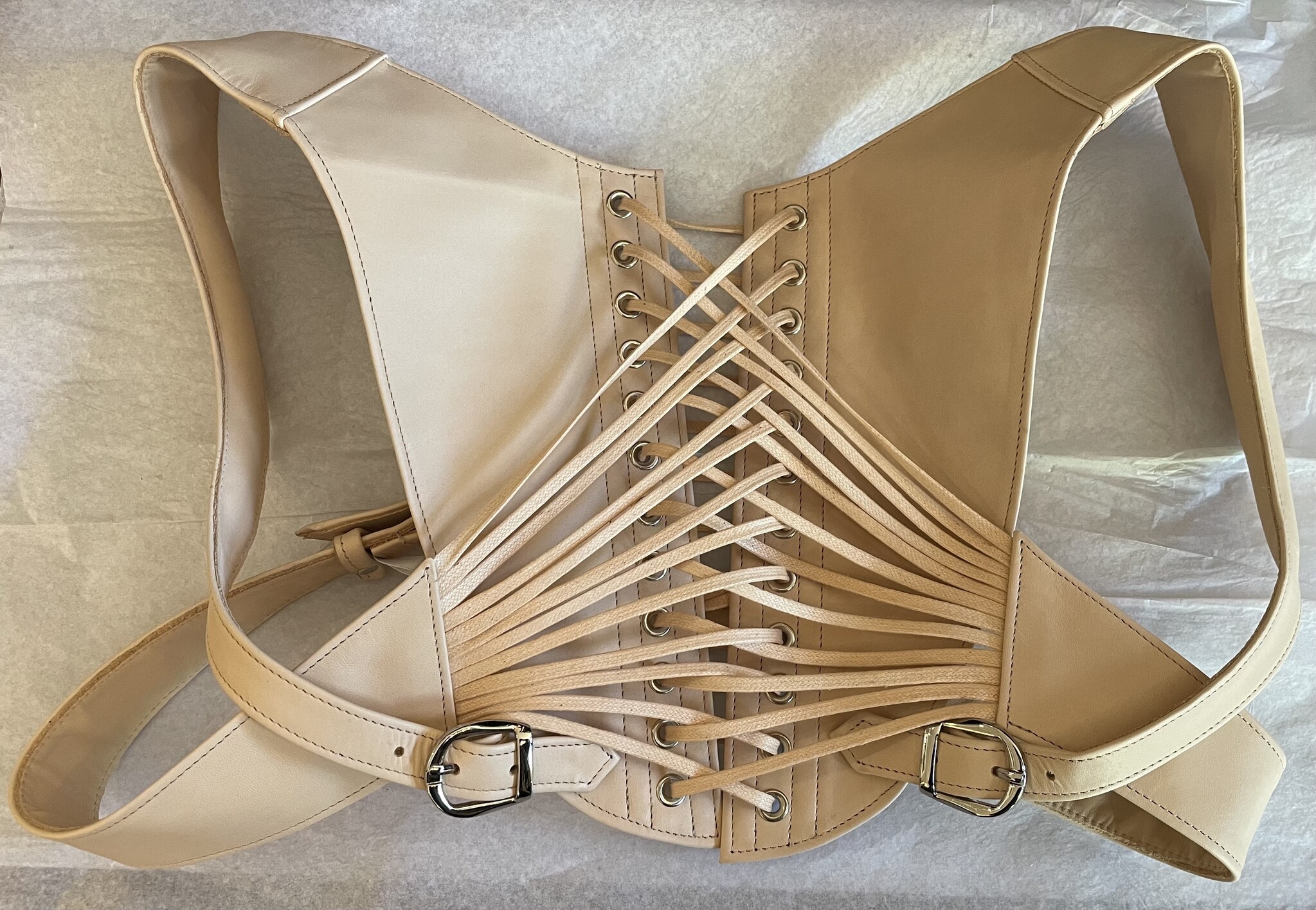 The Posture Harness, inspired by an antique example from 1895, gives gentle pressure against the upper curve where the arm connects to the body to remind you to keep your shoulders back and posture upright. The curve against the arm is lightly padded for maximum comfort. Fan lacing at the back connected to leather straps that buckle in the front allows for an adjustable fit around the ribs.